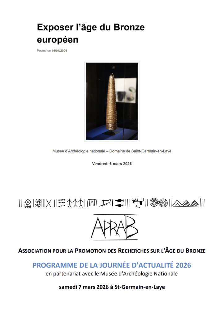 Les 6 et 7 mars auront lieu les Journées de l’Association pour la Promotion des Recherches sur l’Âge du Bronze, au Musée d’Archéologie Nationale à Saint-Germain-en-Laye. Le LRA présentera les